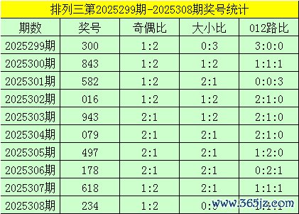 开奖总结:胪列三第2025308期奖号为:234,其奇偶比为1:2,大小比为0:3,奖号012路比为1:1:1。